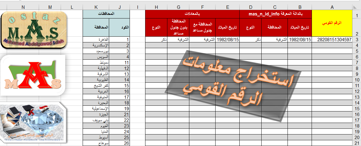 Yasserkhalil Excel Lover استخراج تاريخ الميلاد والنوع ومحافظة